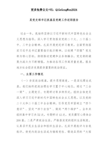 【七哥公文】2025年:某党支部书记抓基层党建工作述职报告+更多免费公文+VX:QiGeGongWen2024+更多免费公文+VX:QiGeGongWen2024