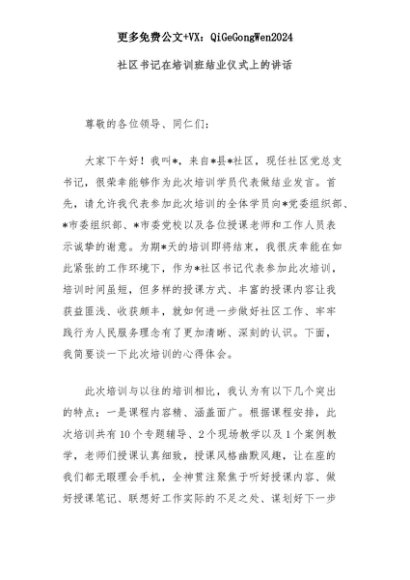 【七哥公文】2025年:社区书记在培训班结业仪式上的讲话+更多免费公文+VX:QiGeGongWen2024+更多免费公文+VX:QiGeGongWen2024