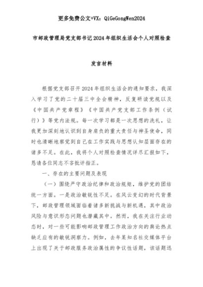 【七哥公文】2025年:市邮政管理局党支部书记2024年组织生活会个人对照检查发言材料+更多免费公文+VX:QiGeGongWen2024+更多免费公文+VX:QiGeGongWen2024