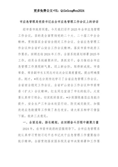 【七哥公文】2025年:市应急管理局党委书记在全市应急管理工作会议上的讲话+更多免费公文+VX:QiGeGongWen2024+更多免费公文+VX:QiGeGongWen2024