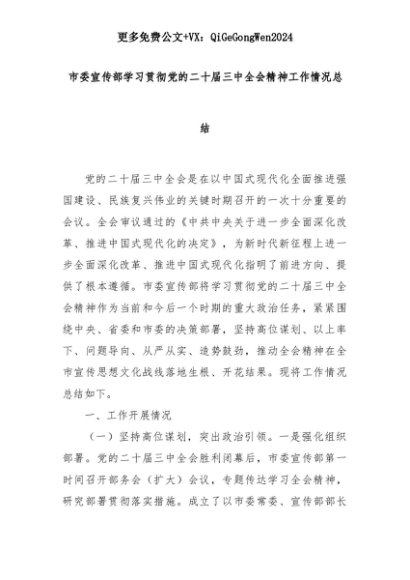 【七哥公文】2025年:市委宣传部学习贯彻党的二十届三中全会精神工作情况总结+更多免费公文+VX:QiGeGongWen2024+更多免费公文+VX:QiGeGongWen2024
