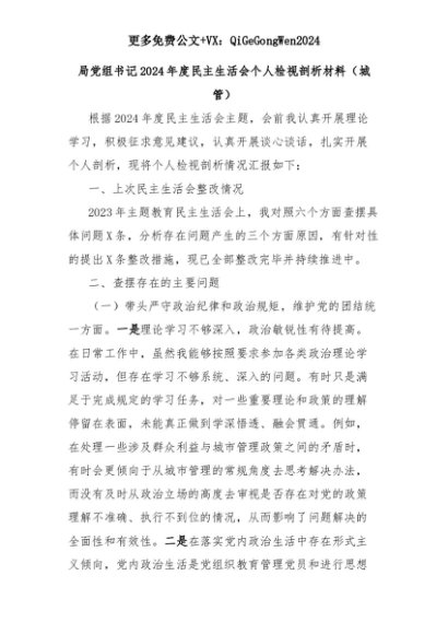 【七哥公文】2025年:局党组书记2024年度民主生活会个人检视剖析材料(城管)+更多免费公文+VX:QiGeGongWen2024+更多免费公文+VX:QiGeGongWen2024