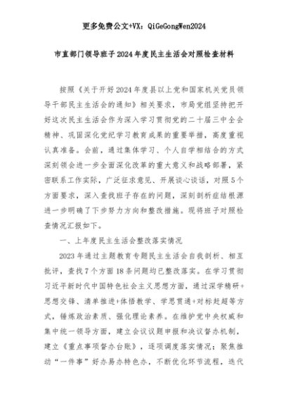 【七哥公文】2025年:市直部门领导班子2024年度民主生活会对照检查材料+更多免费公文+VX:QiGeGongWen2024+更多免费公文+VX:QiGeGongWen2024