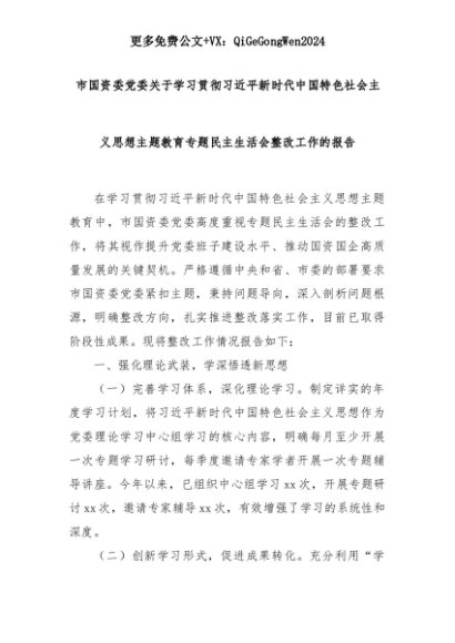 【七哥公文】2025年:市国资委党委关于学习贯彻总书记新时代中国特色社会主义思想主题教育专题民主生活会整改工作的报告+更多免费公文+VX:QiGeGongWen2024+更多免费公文+VX:QiGeGongWen2024