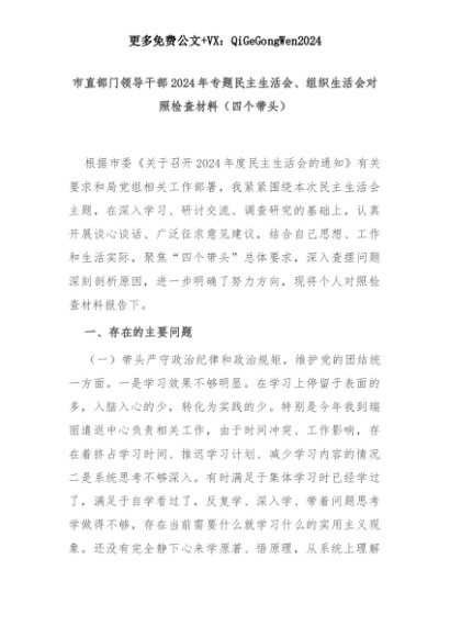 【七哥公文】2025年:市直部门领导干部2024年专题民主生活会、组织生活会对照检查材料(四个带头)+更多免费公文+VX:QiGeGongWen2024+更多免费公文+VX:QiGeGongWen2024