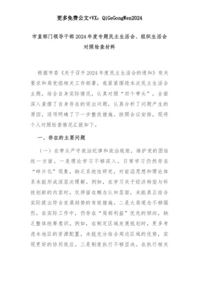 【七哥公文】2025年:市直部门领导干部2024年度专题民主生活会、组织生活会对照检查材料+更多免费公文+VX:QiGeGongWen2024+更多免费公文+VX:QiGeGongWen2024