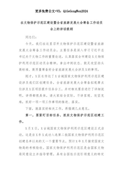 【七哥公文】2025年:在文物保护示范区建设暨全省旅游发展大会筹备工作动员会上的讲话提纲+更多免费公文+VX:QiGeGongWen2024+更多免费公文+VX:QiGeGongWen2024