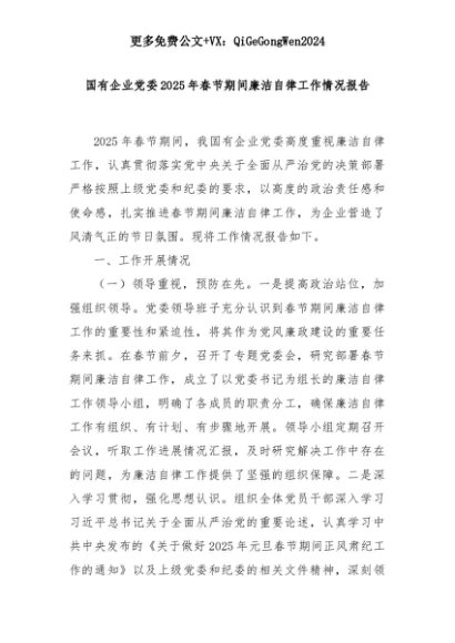 【七哥公文】2025年:国有企业党委2025年春节期间廉洁自律工作情况报告+更多免费公文+VX:QiGeGongWen2024+更多免费公文+VX:QiGeGongWen2024