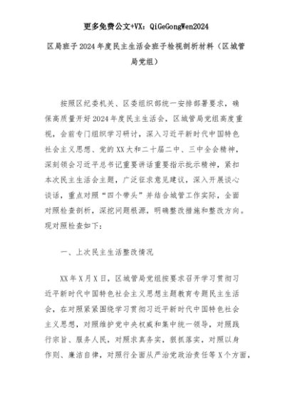 【七哥公文】2025年:区局班子2024年度民主生活会班子检视剖析材料(区城管局党组)+更多免费公文+VX:QiGeGongWen2024+更多免费公文+VX:QiGeGongWen2024