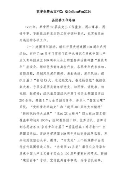 【七哥公文】2025年:县团委工作总结+更多免费公文+VX:QiGeGongWen2024+更多免费公文+VX:QiGeGongWen2024