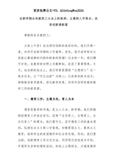 【七哥公文】2025年:在新学期全体教职工大会上的致辞:立德树人守根本,改革创新谱新篇+更多免费公文+VX:QiGeGongWen2024+更多免费公文+VX:QiGeGongWen2024