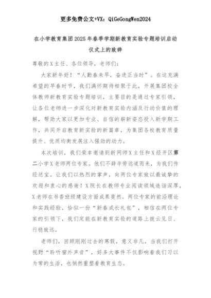 【七哥公文】2025年:在小学教育集团2025年春季学期新教育实验专题培训启动仪式上的致辞+更多免费公文+VX:QiGeGongWen2024+更多免费公文+VX:QiGeGongWen2024
