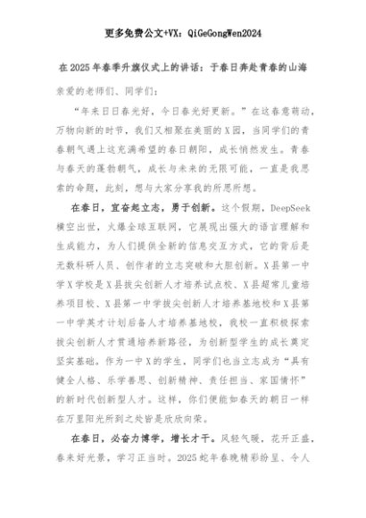 【七哥公文】2025年:在2025年春季升旗仪式上的讲话:于春日奔赴青春的山海+更多免费公文+VX:QiGeGongWen2024+更多免费公文+VX:QiGeGongWen2024
