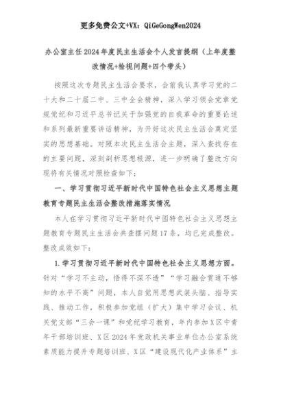 【七哥公文】2025年:办公室主任2024年度民主生活会个人发言提纲(上年度整改情况+检视问题+四个带头)+更多免费公文+VX:QiGeGongWen2024+更多免费公文+VX:QiGeGongWen2024