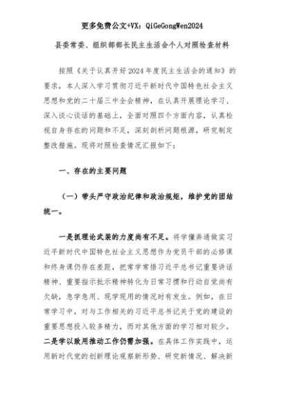 【七哥公文】2025年:县委常委、组织部部长民主生活会个人对照检查材料+更多免费公文+VX:QiGeGongWen2024+更多免费公文+VX:QiGeGongWen2024