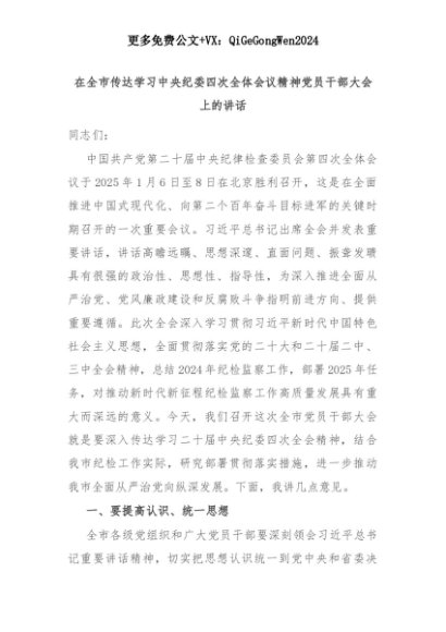 【七哥公文】2025年:在全市传达学习中央纪委四次全体会议精神党员干部大会上的讲话+更多免费公文+VX:QiGeGongWen2024+更多免费公文+VX:QiGeGongWen2024