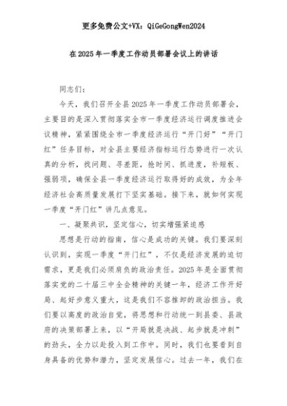 【七哥公文】2025年:在2025年一季度工作动员部署会议上的讲话+更多免费公文+VX:QiGeGongWen2024+更多免费公文+VX:QiGeGongWen2024