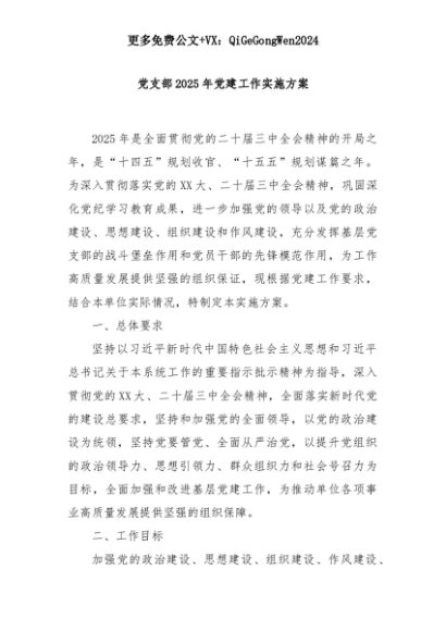 【七哥公文】2025年:党支部2025年党建工作实施方案+更多免费公文+VX:QiGeGongWen2024+更多免费公文+VX:QiGeGongWen2024