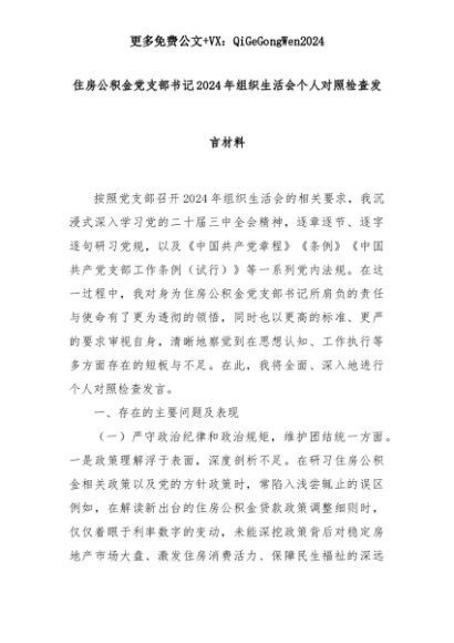 【七哥公文】2025年:住房公积金党支部书记2024年组织生活会个人对照检查发言材料+更多免费公文+VX:QiGeGongWen2024+更多免费公文+VX:QiGeGongWen2024