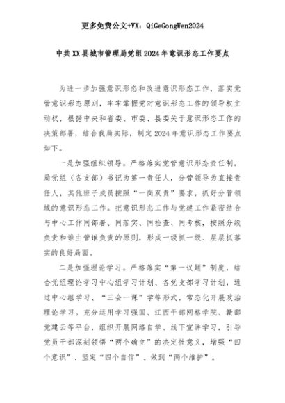【七哥公文】2025年:中共XX县城市管理局党组2024年意识形态工作要点+更多免费公文+VX:QiGeGongWen2024+更多免费公文+VX:QiGeGongWen2024