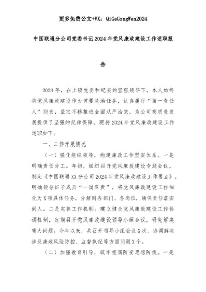 【七哥公文】2025年:中国联通分公司党委书记2024年党风廉政建设工作述职报告+更多免费公文+VX:QiGeGongWen2024+更多免费公文+VX:QiGeGongWen2024