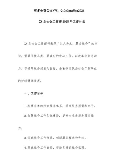 【七哥公文】2025年:4.XX县社会工作部 2025年工作计划+更多免费公文+VX:QiGeGongWen2024+更多免费公文+VX:QiGeGongWen2024
