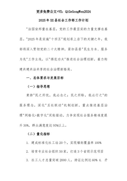 【七哥公文】2025年:2025年XX县社会工作部工作计划+更多免费公文+VX:QiGeGongWen2024+更多免费公文+VX:QiGeGongWen2024