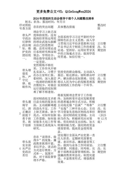 【七哥公文】2025年:2024年度组织生活会领导干部个人问题整改清单+更多免费公文+VX:QiGeGongWen2024+更多免费公文+VX:QiGeGongWen2024