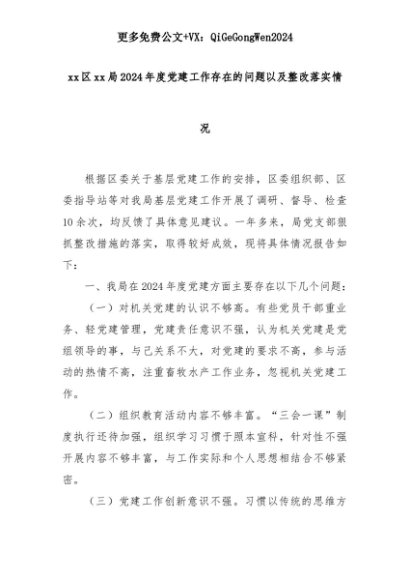 【七哥公文】2025年:xx区xx局2024年度党建工作存在的问题以及整改落实情况+更多免费公文+VX:QiGeGongWen2024+更多免费公文+VX:QiGeGongWen2024