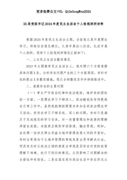 【七哥公文】2025年:XX局党组书记2024年度民主生活会个人检视剖析材料+更多免费公文+VX:QiGeGongWen2024+更多免费公文+VX:QiGeGongWen2024