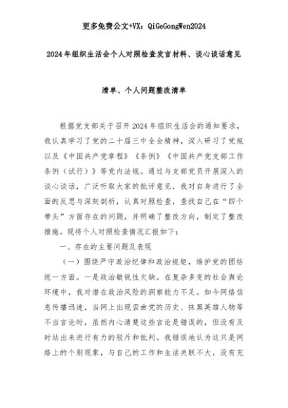 【七哥公文】2025年:2024年组织生活会个人对照检查发言材料、谈心谈话意见清单、个人问题整改清单+更多免费公文+VX:QiGeGongWen2024+更多免费公文+VX:QiGeGongWen2024