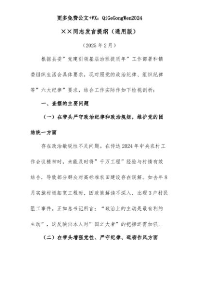 【七哥公文】2025年:2024年度组织生活会个人发言提纲(通用版)+更多免费公文+VX:QiGeGongWen2024+更多免费公文+VX:QiGeGongWen2024
