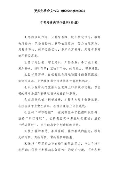 【七哥公文】2025年:(30组)干部培养类写作提纲+更多免费公文+VX:QiGeGongWen2024+更多免费公文+VX:QiGeGongWen2024