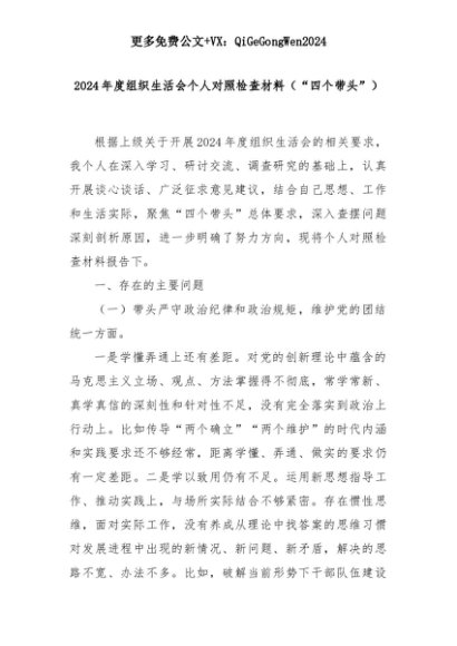 【七哥公文】2025年:2024年度组织生活会个人对照检查材料(“四个带头”)+更多免费公文+VX:QiGeGongWen2024+更多免费公文+VX:QiGeGongWen2024