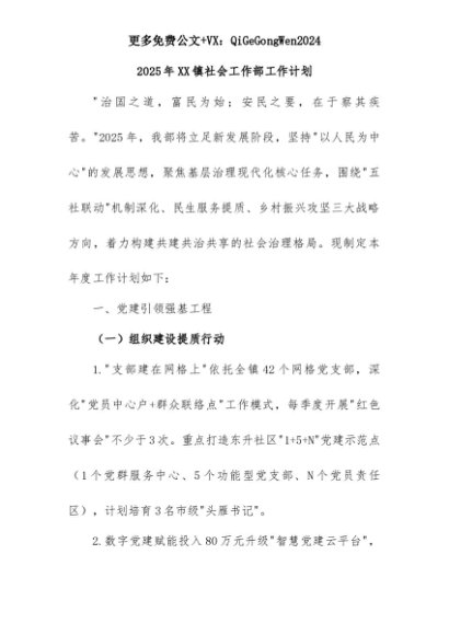 【七哥公文】2025年:2025年XX镇社会工作部工作计划+更多免费公文+VX:QiGeGongWen2024+更多免费公文+VX:QiGeGongWen2024
