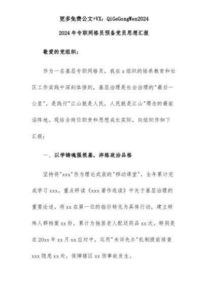 【七哥公文】2025年:2024年专职网格员预备党员思想汇报+更多免费公文+VX:QiGeGongWen2024+更多免费公文+VX:QiGeGongWen2024