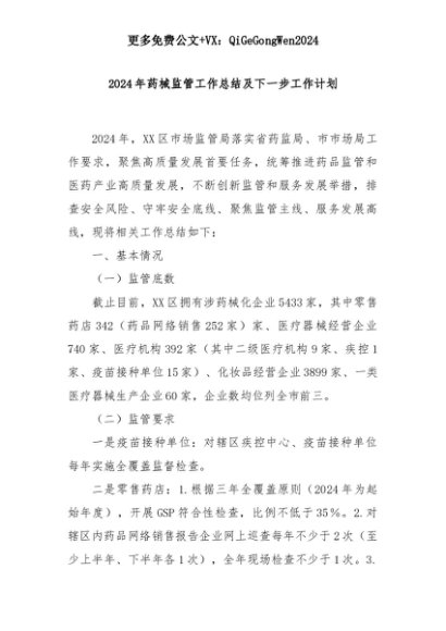【七哥公文】2025年:2024年药械监管工作总结及下一步工作计划+更多免费公文+VX:QiGeGongWen2024+更多免费公文+VX:QiGeGongWen2024