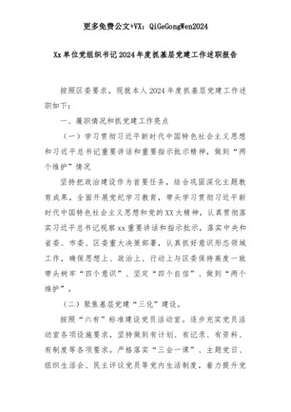 【七哥公文】2025年:Xx单位党组织书记2024年度抓基层党建工作述职报告+更多免费公文+VX:QiGeGongWen2024+更多免费公文+VX:QiGeGongWen2024