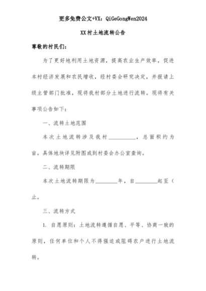 【七哥公文】2025年:2.XX村土地流转公告+更多免费公文+VX:QiGeGongWen2024+更多免费公文+VX:QiGeGongWen2024