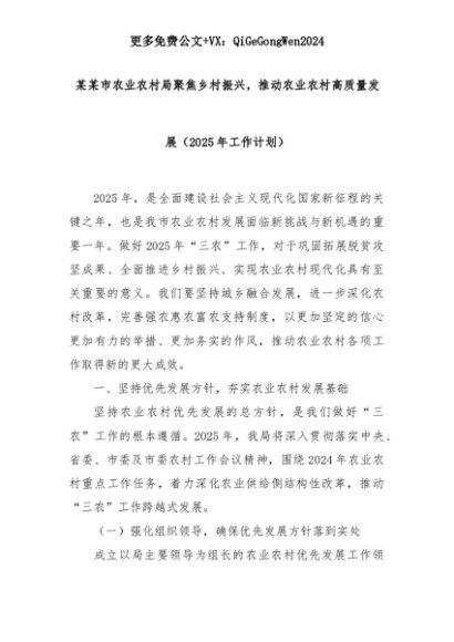 【七哥公文】2025年:某某市农业农村局聚焦乡村振兴,推动农业农村高质量发展(2025年工作计划)+更多免费公文+VX:QiGeGongWen2024+更多免费公文+VX:QiGeGongWen2024