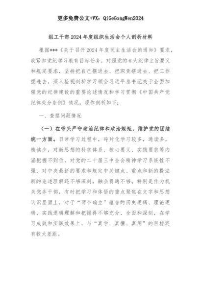 【七哥公文】2025年:组工干部2024年度组织生活会个人剖析材料+更多免费公文+VX:QiGeGongWen2024+更多免费公文+VX:QiGeGongWen2024