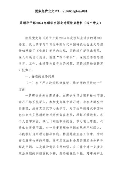 【七哥公文】2025年:某领导干部2024年组织生活会对照检查材料(四个带头)+更多免费公文+VX:QiGeGongWen2024+更多免费公文+VX:QiGeGongWen2024