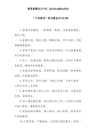 【七哥公文】2025年:(50例)“工作落实”类过渡金句+更多免费公文+VX:QiGeGongWen2024+更多免费公文+VX:QiGeGongWen2024