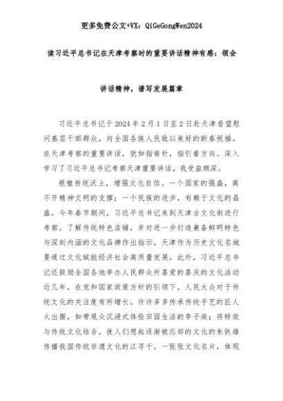 【七哥公文】2025年:读习总书记在天津考察时的重要讲话精神有感:领会讲话精神,谱写发展篇章+更多免费公文+VX:QiGeGongWen2024+更多免费公文+VX:QiGeGongWen2024