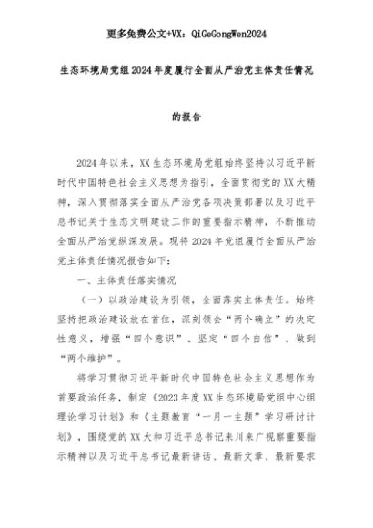 【七哥公文】2025年:生态环境局党组2024年度履行全面从严治党主体责任情况的报告+更多免费公文+VX:QiGeGongWen2024+更多免费公文+VX:QiGeGongWen2024