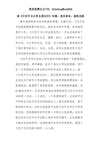 【七哥公文】2025年:读《习近平与大学生朋友们》有感:肩负使命,扬帆远航+更多免费公文+VX:QiGeGongWen2024+更多免费公文+VX:QiGeGongWen2024