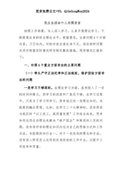 【七哥公文】2025年:民主生活会个人对照发言+更多免费公文+VX:QiGeGongWen2024+更多免费公文+VX:QiGeGongWen2024