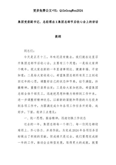 【七哥公文】2025年:集团党委副书记、总经理在X集团总部节后收心会上的讲话提纲+更多免费公文+VX:QiGeGongWen2024+更多免费公文+VX:QiGeGongWen2024