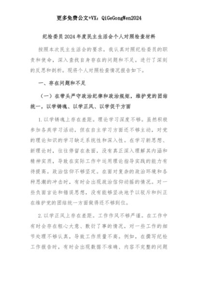 【七哥公文】2025年:纪检委员2024年度民主生活会个人对照检查材料+更多免费公文+VX:QiGeGongWen2024+更多免费公文+VX:QiGeGongWen2024