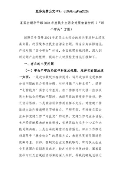 【七哥公文】2025年:某国企领导干部2024年度民主生活会对照检查材料(“四个带头”方面)+更多免费公文+VX:QiGeGongWen2024+更多免费公文+VX:QiGeGongWen2024
